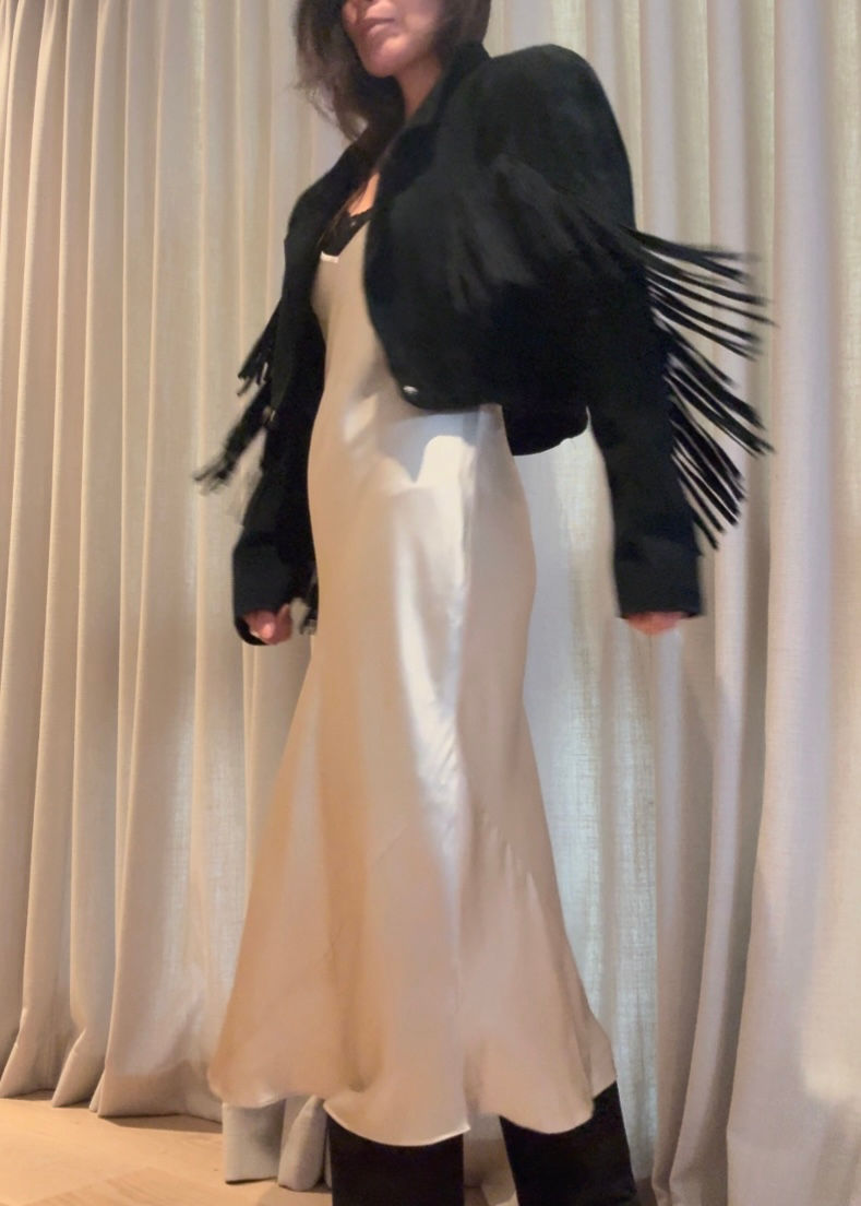 - Shown unpinned on Kam who is 5'3" and typically wears a size 2